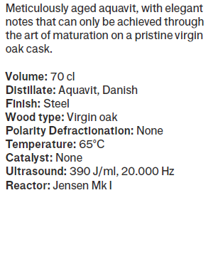 Meticulously aged aquavit, with elegant notes that can only be achieved through the art of maturation on a pristine virgin oak cask.